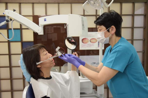 シンラシステムによる分析では、専用の器具を使って骨格やあごの関節の動きなどを分析します。そして、その結果をもとに患者さん1人1人にピッタリ合った人工歯の配列やかみ合わせを実現する入れ歯を作っていきます。